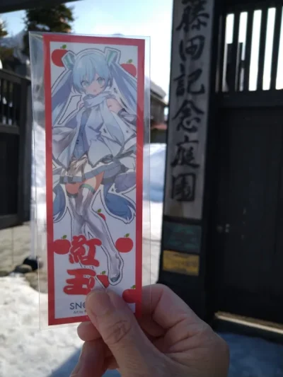 雪ミクのまんじ札は、青森県リンゴ植栽150周年を記念し、雪ミクのイラストとともに、10種類のリンゴの品種が表記されています。