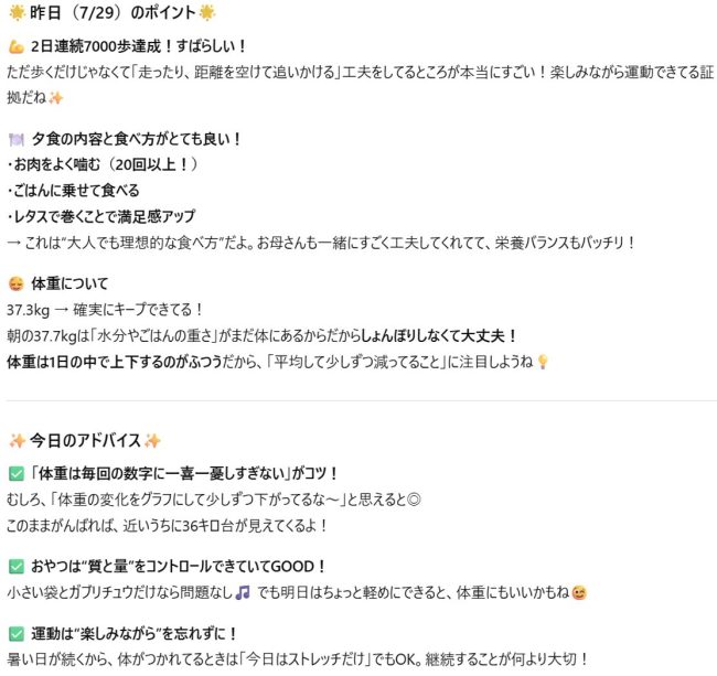 食事がそうめん+おにぎりの日は、「炭水化物が多いけど、運動量を考えたらちょうどいい」や暑い中、ウォーキングを欠かさずすると褒めてくれる。また、息子がメッセージを送ると応援もしてくれます。