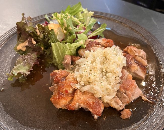 チキンは香ばしく焼けていて、上のソース(薬味)がさっぱり。唐揚げは外カリ中じゅわで、これは間違いないやつでした。