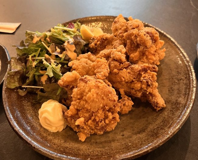 チキンは香ばしく焼けていて、上のソース(薬味)がさっぱり。唐揚げは外カリ中じゅわで、これは間違いないやつでした。